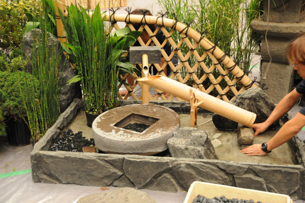 鹿おどしセットの音が重要です。何回もテストをし、鹿おどしの竹で石が動かないことを確認します。